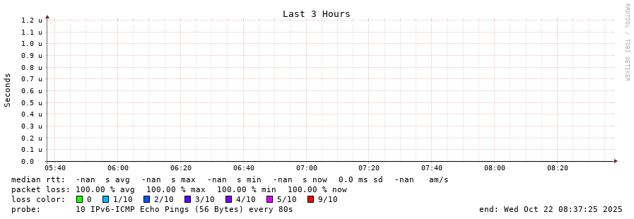 traceroute to fd9b:f75:a3d5::2 (fd9b:f75:a3d5::2), 30 hops max, 80 byte packets - Generated at 2025-10-21 22:30:02 3 > den-b3-link.ip.twelve99.net (2001:2035:0:18f8::1) [AS1299] 0.649ms !N0.504 ms!N
