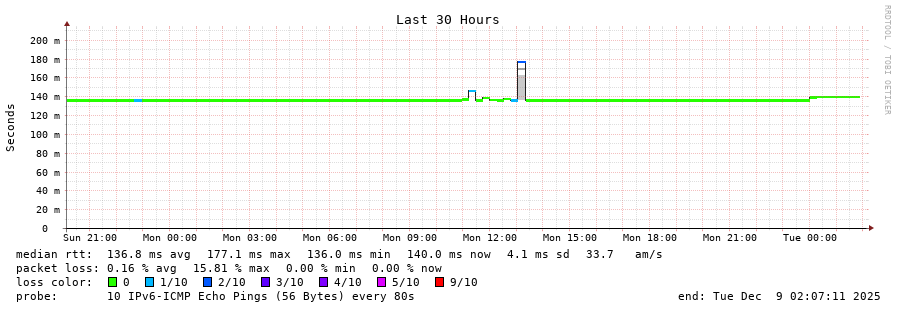 traceroute to 2a00:c30:bbbb:d::2 (2a00:c30:bbbb:d::2), 30 hops max, 80 byte packets - Generated at 2025-12-08 21:45:01